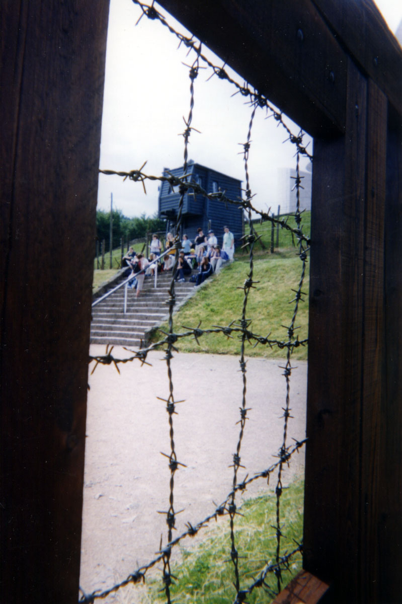 A school group, seen sitting on the terrraces where the prisoner barracks stood,trying to take it all in. A guard tower stands behind them. Photo and text Copyright Diana Mara Henry