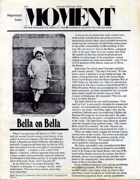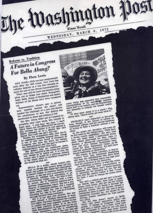 The photograph above is of Bella at the Battery, the first time I saw Bella. I had neard her interviewed on the radio, and her voice made me think I wanted to meet her. It was 1972. She was protesting the jerrymandering of her district on Manhattan's Upper West Side, and the news report announced the time of the press conference. I heigh-tailed it down to the other end of Manahttan, and I was so excited, I dropped my lens as I was kneeling at her feet to take the pictures. I brought the photographs up to her campaign headwuarters, met Mim Kelber, and this one was chosen for some super large posters for her campaign, as well as for this flyer.