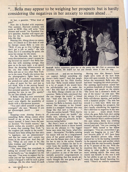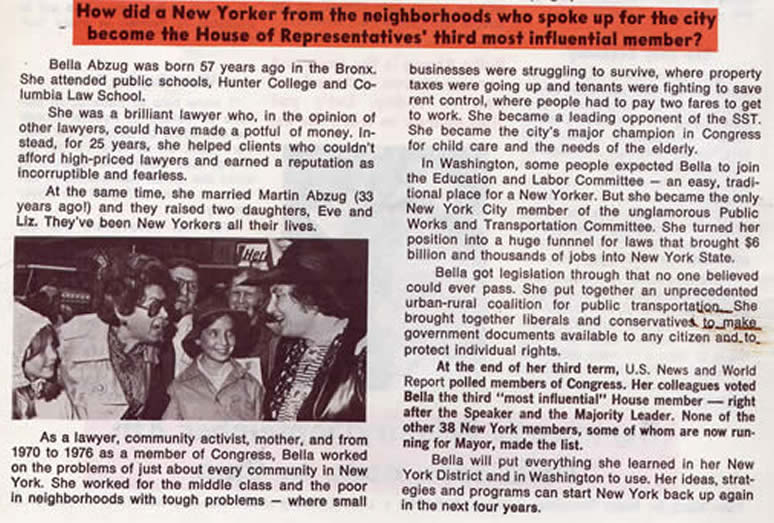 Enjoy these campaign materials from Bella's race for Mayor. Above, in the crush of campaigning along the sidewalk, Bella is accompanied by her daughter Liz now head of Liz Abzug Consulting Services and the Bella Abzug Leadership Institute and behind her, in boater, Harold Holzer, who became a renowned Shakespeare scholar and Metropolitan Museum Vice-President.