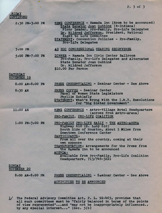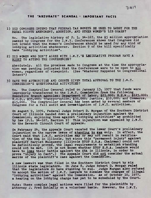 Diana Mara Henry kept ephemera of the events she photographed, as here, Phyllis Schlafly's press conference at the time of the First National Women's Conference in Houston, 1977 and the materials Schlafly produced opposing the ERA, IWY, and BElla Abzug - "ABZUGATE".
