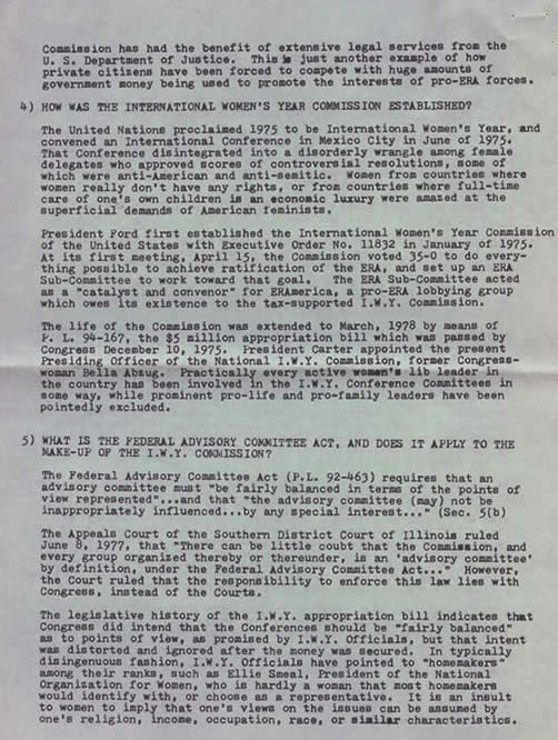 "At its first meeting chaired by former Congresswoman Bella Abzug (April, 1977) the National I.W.Y. Commission voted to urge state I.W.Y. Conferences to add lesbianism and prostitution to heir discussion agendas, as requested by I.W.Y. Commission member Jean O'Leary, who is Co-Executive Director of the National Gay Task Force." Jean O'Leary is at right, below.