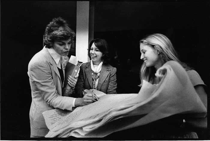 and run it any way they like...". Jill Ruckelshaus, the first Presiding Officer of the US COmmission on International Women's Year, was named by President Ford, who signed the ligislation for the conference. Jill Ruckelhaus, seen at left with Pat Kery and Peggy Kokernot, right, is signing the scroll of participants. She was followed in office by Elizabeth Athanasakos, another Republican and part of the old guard of the Republican party who were pro-choice, pro-ERA.