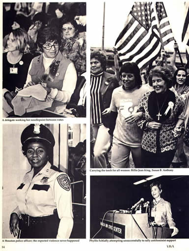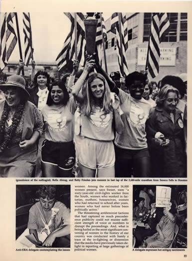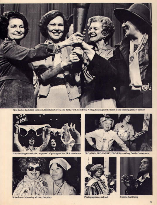 This photograph also was published on the cover of The Village Voice. It shows women at the First National Women's Conference waving bras on which they wrote the message: "We didn't burn them" in an effort to correct a media-created myth.