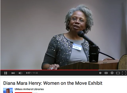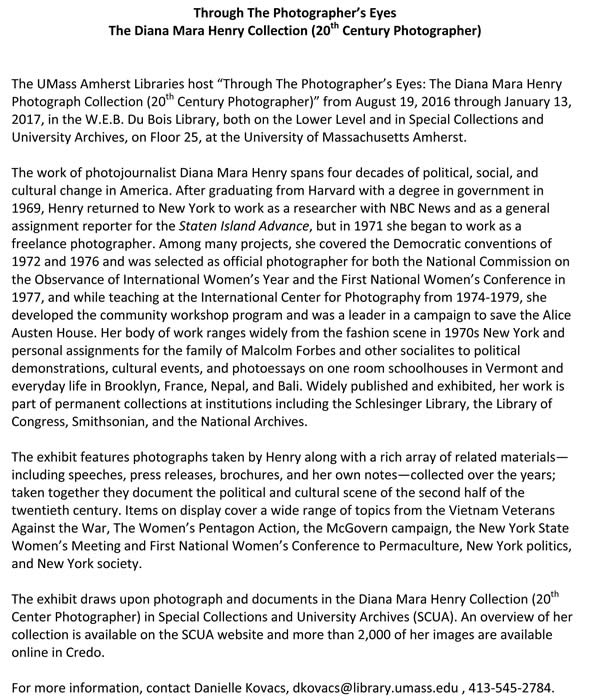 This is a great time to look back with friends (like Patt Blue, who took the photo above of DMH with her Special Collection at UMass Amherst) and to say thank you for standing by me. Thank you to Rob Cox, Head of Special Collections and University archives, for his quick decision to take the collection; to Carol Connare, head of Development and Communications for making a beautiful film, and for her friendship; to Danielle Kovacs, Curator of Special Collections, for a beautiful exhibit - and more; to Kim Fill, for her kindness; to Kirstin Kay for her elegant poster- see below - and great installation photographs; to Gail Epps for making the first video in Carmel in 1990, and to the people in my photographs, from the bottom of my heart, the two dozen or so who came to the reception on September 25, 2016 and those who were there in spirit. Diana Mara Henry's new book, A Life in Photography, sold out at the event but Women on the Move is still available if you order it here, or via NY Foundation for the Arts if you would like your contribution to be tax-deductible...