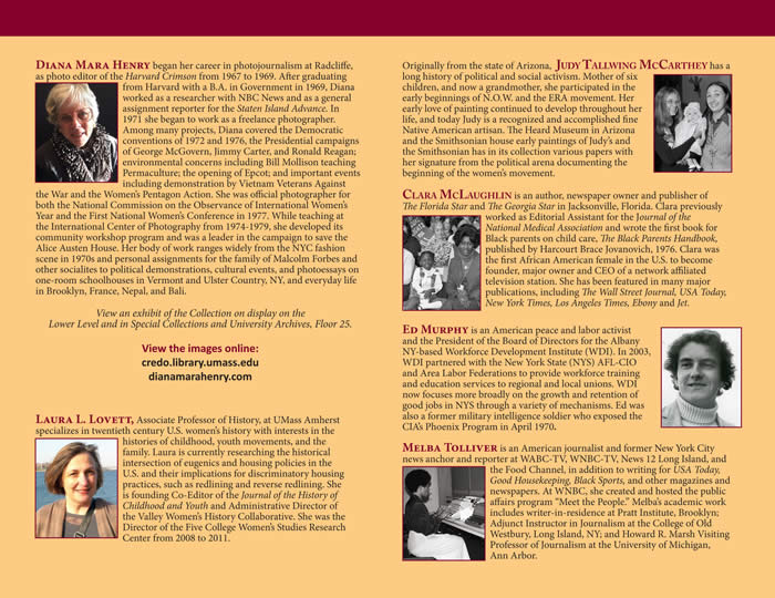"Diana Mara Henry not only had the foresight, energy and caring to record a history that media at the time often thought unimportant, she also had an open heart and democratic spirit that caused her to record the people who were really there and working, not only those who might have been thought newsworthy at the time.Not only was she present with a camera, but with eyes that could see the many who might have been forgotten without her record. I'm very grateful to her. I think the future will be more and more grateful. Gloria Steinem"