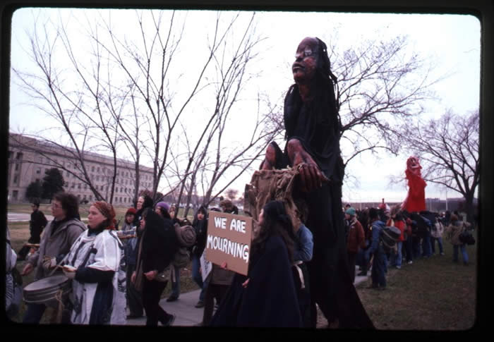 "As the women approached the Pentagon they were joined by drummers and by four women carrying large puppets in the form of women, each symbolizing a different stage of the demonstration: one was in black, for mourning; another figure in red, for rage; a third was yellow, for empowerment; and the fourth puppet, in white, symbolized defiance."