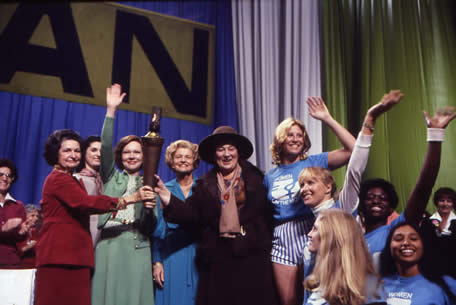 Congresswoman Elizabeth Holtzman applauds in background, at left, as Ladybird Johnson, Rosalyn Carter, Betty Ford, first ladies, Linda Robb behind them, and Bella Abzug hold high the torch at the opening of the First National Women's Conference, Houston, 1977. Donna de Varona stands beside them, Suzy Chaffee and Michelle Cearcy below, and in foreground, Peg Kokernot and Sylvia Ortiz.