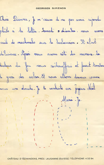 A note from Marie-Jo Simenon, middle child of Georges and Denyse Simenon. Marie-Jo later died tragically by her own hand. She wrote to DMH during the time that Diana had been brought into the Simenon family circle to be a friend to the children. The Henry family and the Simenon family had met in Bürgenstock, Switzerland, when Diana was 14. Georges Simenon said she spoke the most perfect French he had ever heard. (His exact words inscribed, below.) He invited her to join the family the next summer for a month at their castle as their cloistered children's guest. Diana Mara Henry is working on an illustrated autobiography of her life, with a working title of Golden Girl: My Walk through History, which will include more of these memories.