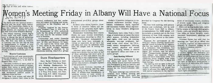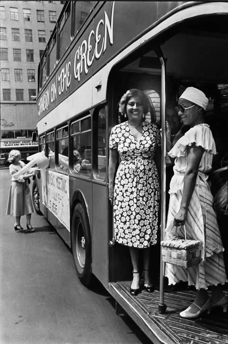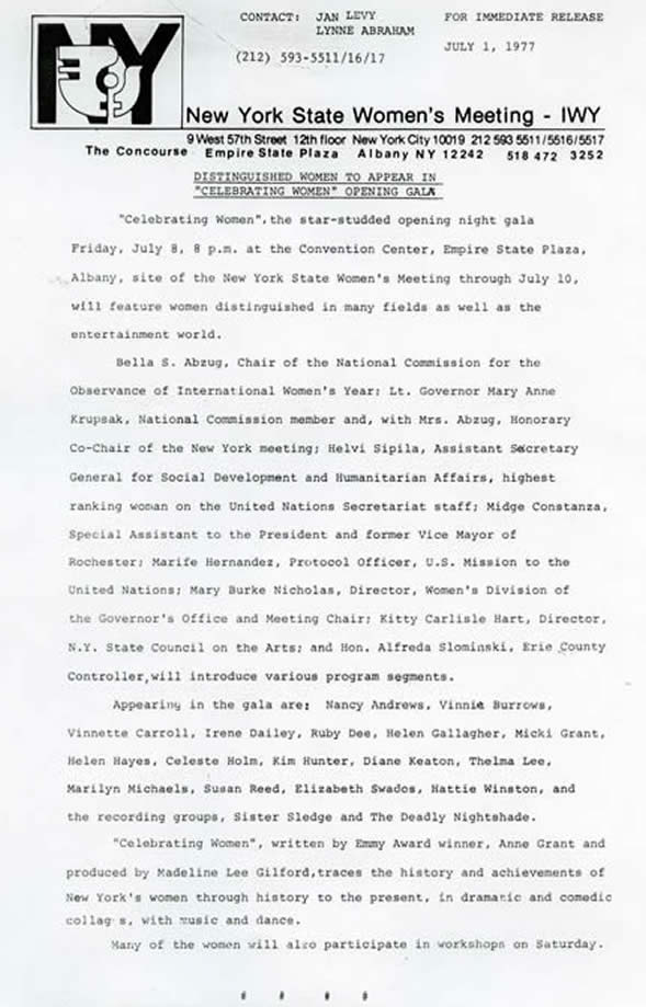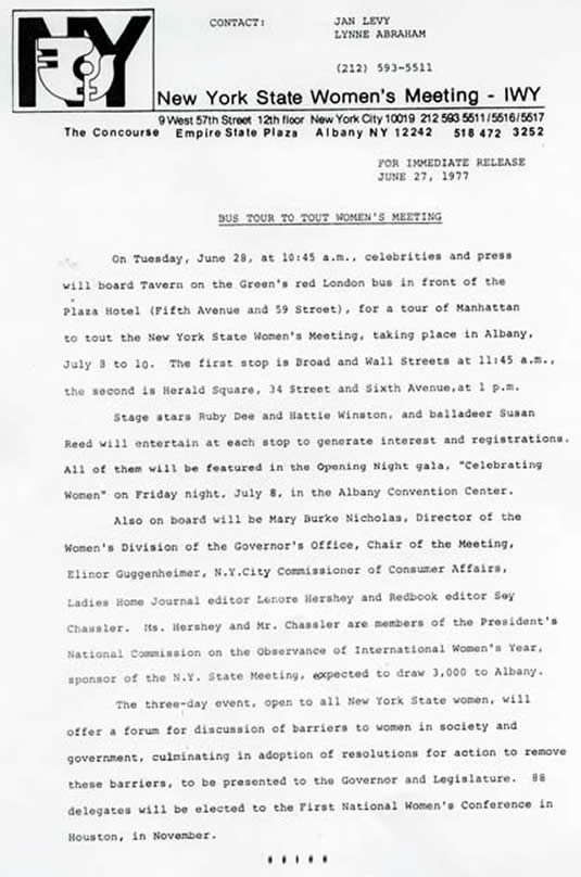 Ruby Dee and Mary Burke Nicholas set  up for their bus tour to tout the New York State Women's meeting as announced in the above press release, from in front of the Plaza Hotel, NYC, on June 28, 1977.