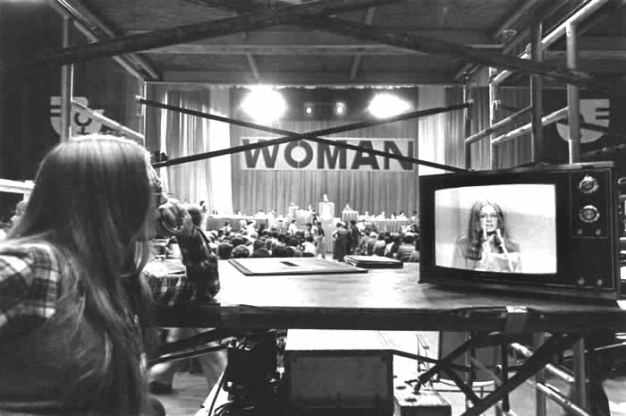 right: Gloria Steinem speaking at Women's caucus, Democratic National convention, 1976.