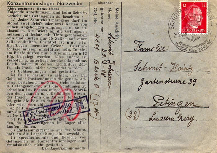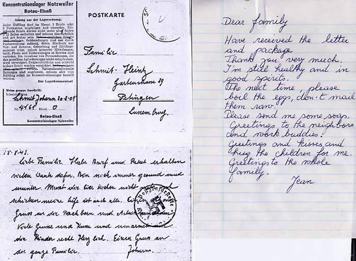 Jeanne L. has provided precious materials for this website about her father Jean Schmit. He "was incarcerated as a political prisoner from Luxembourg. In 1942 he was taken during the night and we first heard from him when he was sent to Hinzert, then transferred to Natzweiler where he was able to communicate with his family via mail , the first letter came July 13th, 1943. The last letter my mother received was Feb. 26th 1944. No more news after that. "