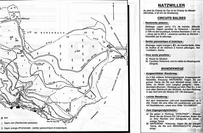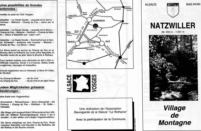 As can be seen from the tourist brochure below, published by a nature conservation group, "Sauvegarde de la Nature La Rothaine" in cooperation with the village of Natzwiller, the hikes described do not include mention of the concentration camp next to which they pass, even though it is a French National Monument and major tourist attraction with over 150,000 visitors each year.