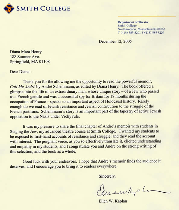 Sincerely, Ellen W. Kaplan, Professor of Theatre, Smith College, Northampton, Massachusetts.
