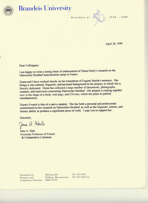 Sincerely, Jane A. Hale, Associate Professor of French and Comparative Literature, Brandeis University."
