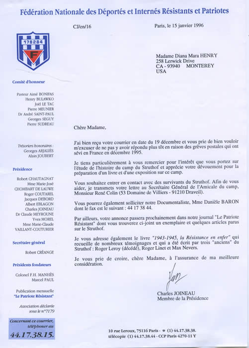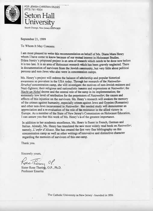 "I am pleased to have the opportunity to endorse, without reservation and with much enthusiasm, Ms. Diana Henry and her research project on the Nazi Concentration Camp, Natzweiler-Struthof...Her work when complete will be a particularly important addition to the literature of the Holocaust, raising questions uniquely suited to this particular camp. ...She is asking the right questions of her material, including some new and important ones...Considering the construction of a historical web site ( something that a great many of the camps already have, much to the benefit of scholarship...I see her photographic eye of enormous benefit....