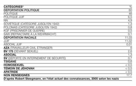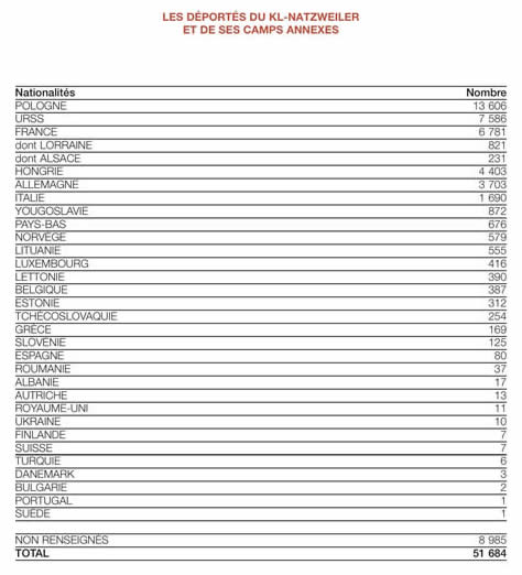 Figures from the European Centre on Resistance and Deportation for the numbers of prisoners from thirty European countries imprisoned at Natzweiler-Struthof, and the categories into which they were grouped by the Nazis.