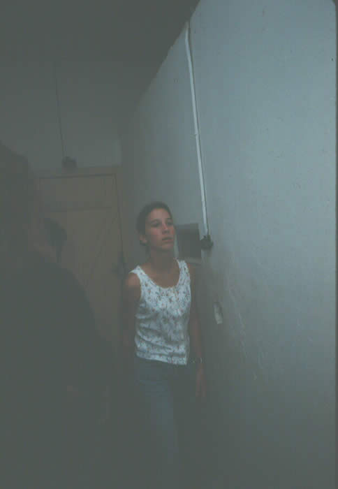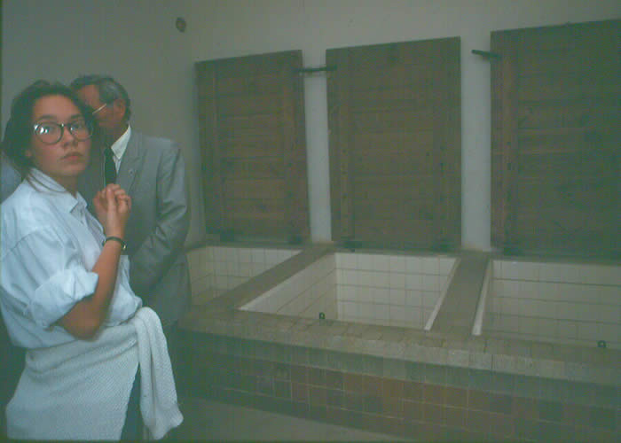 A French school girl has just finished looking through the window into the gas chamber, as those who did the gassings were able to do.
