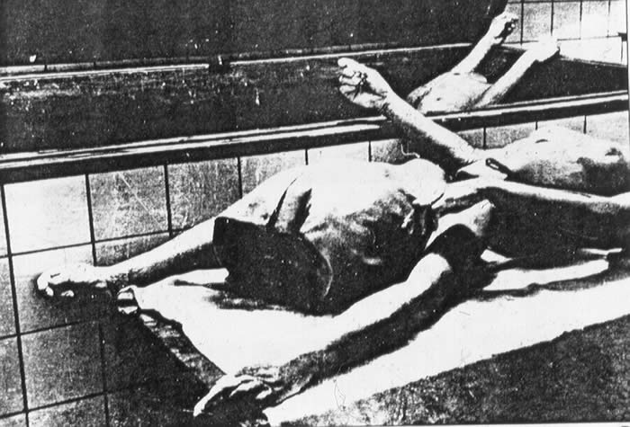 The following image, taken just to the right of the gas chamber,shows the tiled vats where partially dissected bodies were stored in preservative solution.