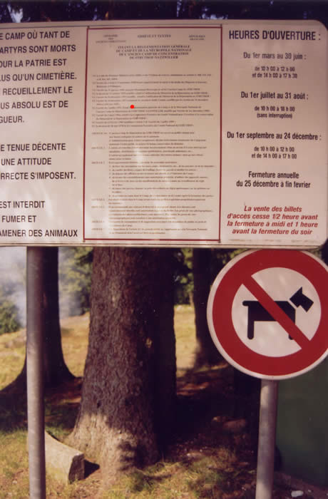 The signage at right reads: "This camp where so many martyrs died for their homeland is more than a cemetery. A most absolute dignity is required. Decent clothing and behavior are required. Smoking and pets are not allowed."