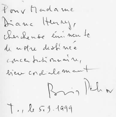 [For Mrs. Diana Henry, eminent researcher of our concentration camp destiny, Very cordially, Boris Pahor, T(rieste), September 5, 1999]