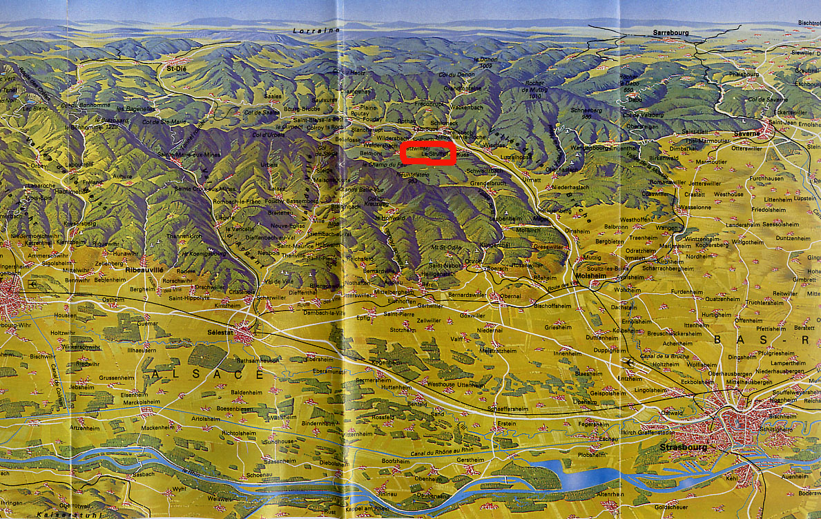 Almost straight west of Strasbourg, in the foothills of the Vosges Mountains, just up from valley where the Bruche, a tributary to the Rhine, runs through. Natzwiller, as the Alsatian spelling gives it, is a lttle town. Le Struthof is a farmstead and overlook of the valley where there was a ski resort and inn before WWII, and where, during the war, the inn continued to serve guests who could watch naked Jews and Gpsies being led into the gas chamber across the street. ( see Judy Chicago's Holocaust Project for more on this.) Today, one can still dine at the inn across the street from the gas chamber. In this map, the Rhine River and Germany are at the very bottom, we are looking West. Strasbourg is the city at bottom right, Colmar is the city just visible at left.