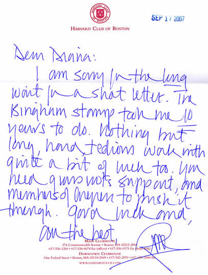 Congressman Rob Simmons worked for 10 years to bring the Hiram Bingham stamp, part of this 2006 series, to issuance. His message to Diana Mara Henry follows.