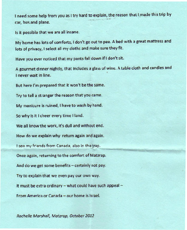 I’ve attached Rochelle’s poem at the end, written when she was last on a tour of duty with Sar-El, five months ago....