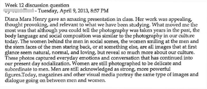 Professor Laura Lovett of U Mass Amherst invited Diana Mara Henry to give an illustrated lecture to her class in Women's History and assigned her students to write answer a discussion question that evening. They did great!